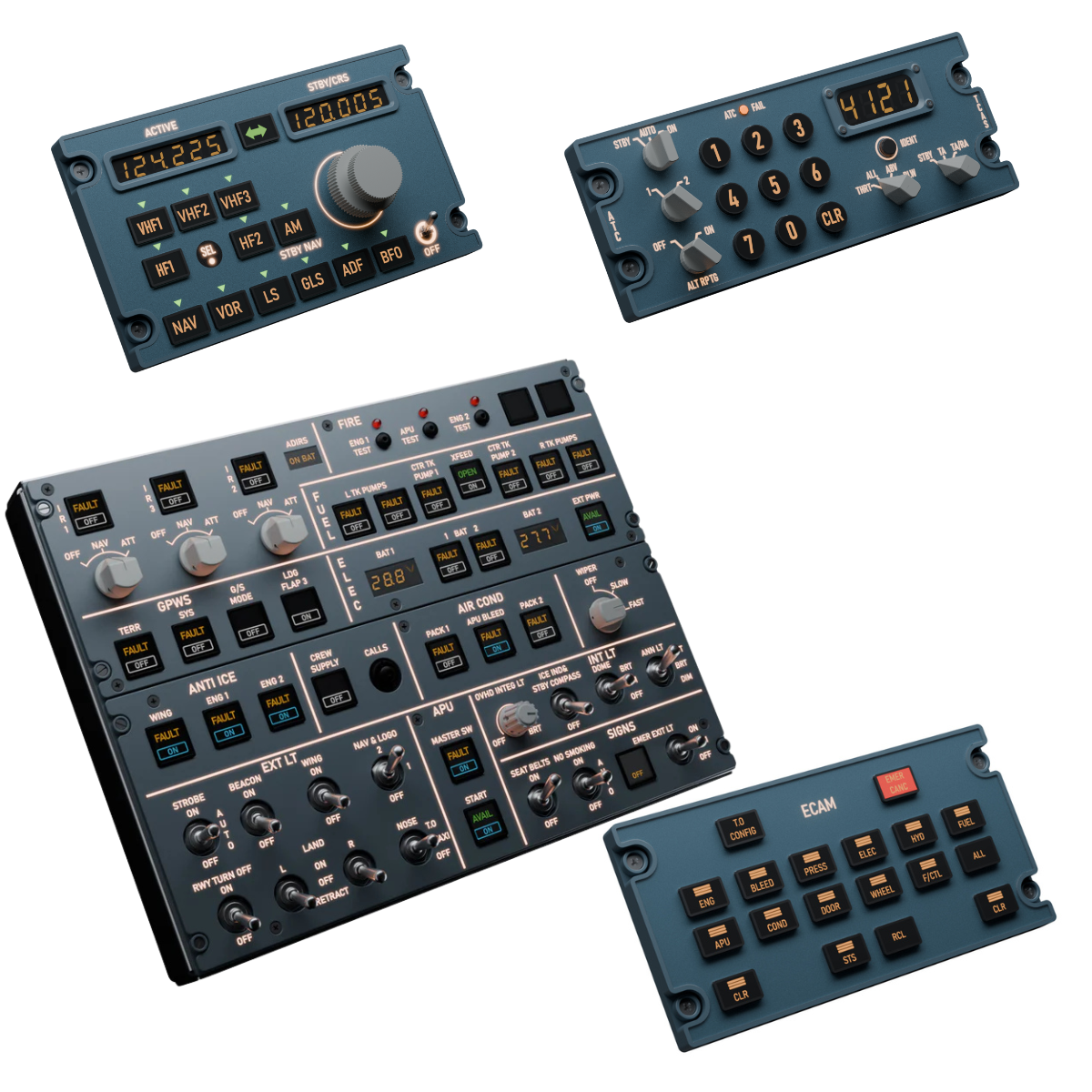 Modelled after the Airbus A320 layout, this bundle includes three essential panels from the centre pedestal: the ECAM Control Panel (available in three versions), the TCAS Control Panel, the RMP (Radio Management Panel), and the Compact OVH Panel. Each unit faithfully replicates the original Airbus design with fully functional push buttons, knobs, potentiometers, and LED indicators, delivering authentic interaction and precision.